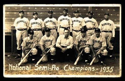 That tall, lanky kid at the center of the back row would find his way into Cooperstown thirty-six years later, after a career that was over twenty years old before he even hit the Majors. This team was certainly one of the most notable, the famed Bismarck squad that featured an inte-grated line-up a dozen years before Robinson hit Ebbets. Remarkable collectible derives from the estate of another Negro League HOF'er, the beloved Cool Papa Bell. His name is legible in faded pencil on verso, and closing line of text reads, "Regards to all, Toadalo and Satchell." Postmark is from Kansas City, 1935. Minor back damage from having been removed from a scrapbook. Card is technically VG+, with much better appearance.
