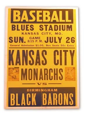 Two of the greatest teams in Negro League history square off for the fans at Kansas City's Blues Stadium. The Kansas City Monarchs meet the Birmingham Black Barons. Cardboard sign was once folded into quarters, leaving even creasing that is hardly noticeable. Appears much better than technical VG-EX rating. (14x22")