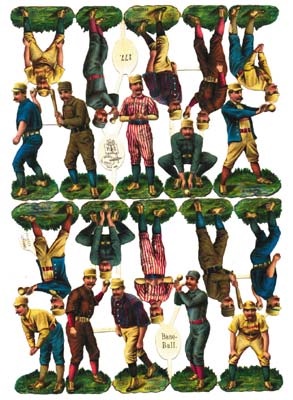 In these two beautifully lithographed sets of Victorian "scraps", each player represents the teams in the National League in thrilling colors. This is the first set we have seen where the two are attached! All of the teams are here including Detroit, Pittsburgh, Brooklyn, Baltimore, Indianapolis, Chicago, Boston, New York, Philadelphia, and St. Louis. There is a total of 20 cards, all of which are die-cut and glorious! These are by the famous postcard maker, German lithographer Rafael Tuck. NRMT.