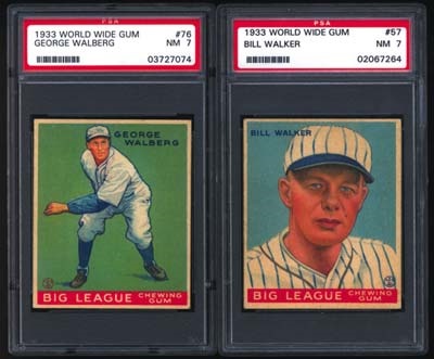 The World Wide Gum Company, who produced these in 1933, was the Canadian subsidiary of Goudey. There are two PSA 7's in this lot: George Walberg, #76 and Bill Walker, #57. There are four differ-ent PSA 6's in this lot: Oswald Bluege, #83, Max Bishop, #61, Edmund Miller, #59, and Bill Walker, #57. The backs are printed in English only.