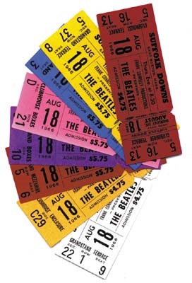 This set of eight full, unused tickets for the group's Suffolk Downs appearance in Boston was acquired from the con-cert's co-promoter, Gerald Roberts, in 1987. His LOA explains that he and Frank Connely booked the racetrack for $1,000 without mentioning the purpose for which it was to be used. Incidentally, the track's owner was major league baseball magnate, Bill Veeck. 25,000 were in atten-dance. NRMT/Mt.