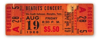 Several death threats, a bomb scare and a KKK demon-stration preceded the Beatles' two concerts at the Mid-South Coliseum in Memphis. 22,500 very well- behaved fans attended the two performances. An exploding cher-ry bomb during the evening concert caused hearts to race momentarily. This full, unused ticket for the evening show exhibits some creasing and discoloration.