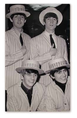 This spectacular photograph from England features the Beatles in straw hats. NRMT.