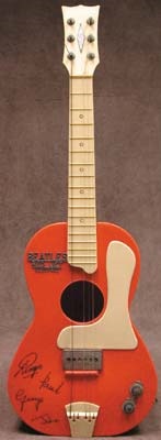 This rare toy Beatles guitar from England was even electrified (although cord has been clipped). It was manufactured by Selcol at the height of Beatledom. Some wear on the dials and pick ups, and some light scratching. One surface crack, barely visible on the top of "P" to the pick up.