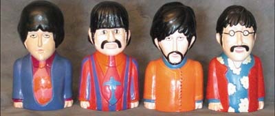 These 8" figures were produced by Pride Creations in 1968 out of a paper mache type material. All four have both original tags and rubber stoppers. They are all in drop-dead NRMT condition with bright paint. George has a tiny nick on bottom reverse and an almost unnoticeable paint fleck on front of George and Ringo.