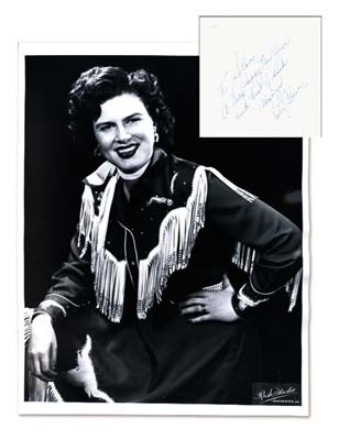 You'd have to be "Crazy" to pass up this rare opportunity-Cline signatures are super-tough. The tragic songstress inscribed the back of this black and white 8x10" promo photo, "To Stan, A very Happy New Year and best of Luck, Always, Patsy Cline." Ink is NRMT, as is the photo itself.