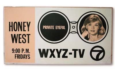 Another great display for spy fans. From the 1966 hit show Honey West, who was television's loveliest private detective. Ann Francis is shown here on this WXYZ-TV advertising bus sign. VG-, except two corner cut and few long light creases.