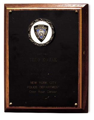 Kojak! Kojak! This plaque reads "In Recognition Of Your Outstanding And Dedicated Service To The New York City Police Department" and is signed by the Commissioner of the NYPD. This treas-ure actually hung above Theo's desk on the show.