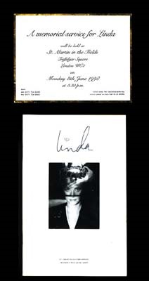 This delicate paper duo contains the invitation for Linda's memorial service in London, June 8,1998 as well as a poignant pro-gram with touching and personal words from Paul and the children and a schedule with lyrics, poems, and listings -- including "Let It Be," a quartet, and Pete Townshend performing. A very thoughtful set.