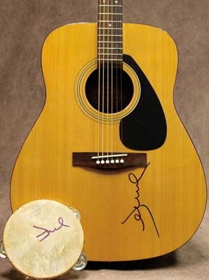 This Yamaha acoustic guitar and tambourine were both signed by Jewel when she appeared on MTV in New York.