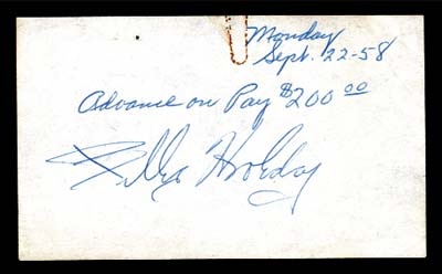 More than forty years after her death Billie Holiday remains the most famous of all jazz singers. "Lady Day" (a nickname given to her by Lester Young) had an innovative behind-the-beat phrasing made her quite influential. The emotional intensity that she put into the words she sang was memo-rable and sometimes almost scary; she often really did live the words she sang. This signed receipt for a pay advance from 1958 is clean and crisp, with a rust mark from a paper-clip that doesn't affect the NRMT signature.