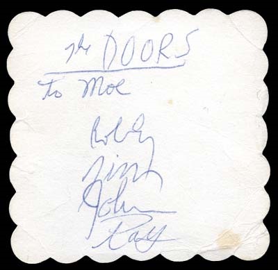 A drink coaster, on one side is printed, "Your waiter's name is...Joe." The other side is inscribed, "The Doors - To Moe, Robbie, Jim, John, Ray," each in their own hand. EX, a few light stains and creases not affecting the signatures.