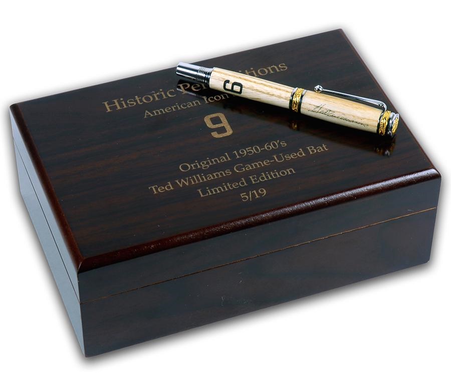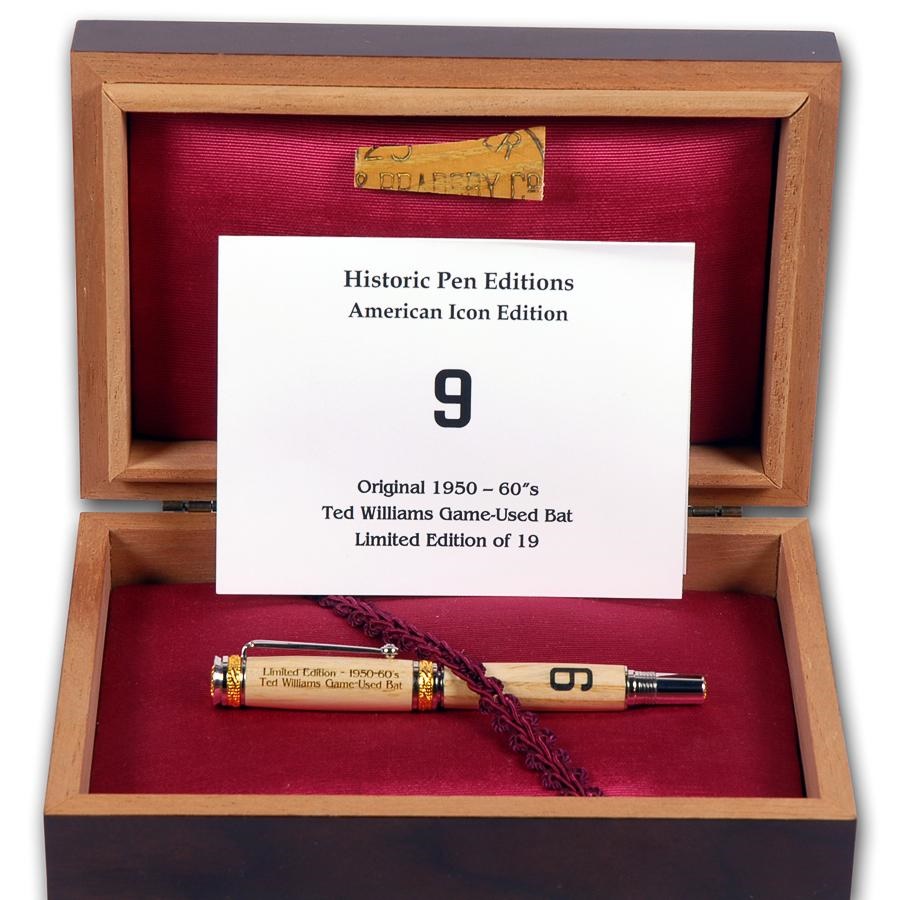 "History at your fingertips" is the tagline for the brand of this very special pen, made from an authentic 1950s-1960s Ted Williams game-used bat. This has long been a sold-out edition, and this particular pen is numbered 5 out of 19 pens made. It measures 5 1/2" in length and is about 3/4" wide. Special touches include a "Ted Williams" signature carved into the side of the pen, gold and silver tones on the top, middle, and bottom of the pen, and a small crystal. The pen twists open to reveal slick black ink, and comes in a beautiful wooden mahogany box with a black velvet carrying pouch for the pen. A piece of the Williams bat is attached to the inside of the box (part of the center Louisville Slugger band). LOA from Historic Pen Editions LLC. Bat certified authentic by Mears.