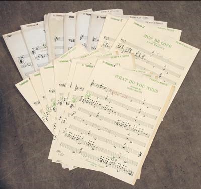 An assortment of musi-cian's charts for the vari-ous brass and string instruments in each of four different songs. Music notated is for multi-ple trombones, trumpets, and solo cello. A subtle grouping of studio ephemera actually con-nected to the recording process itself.