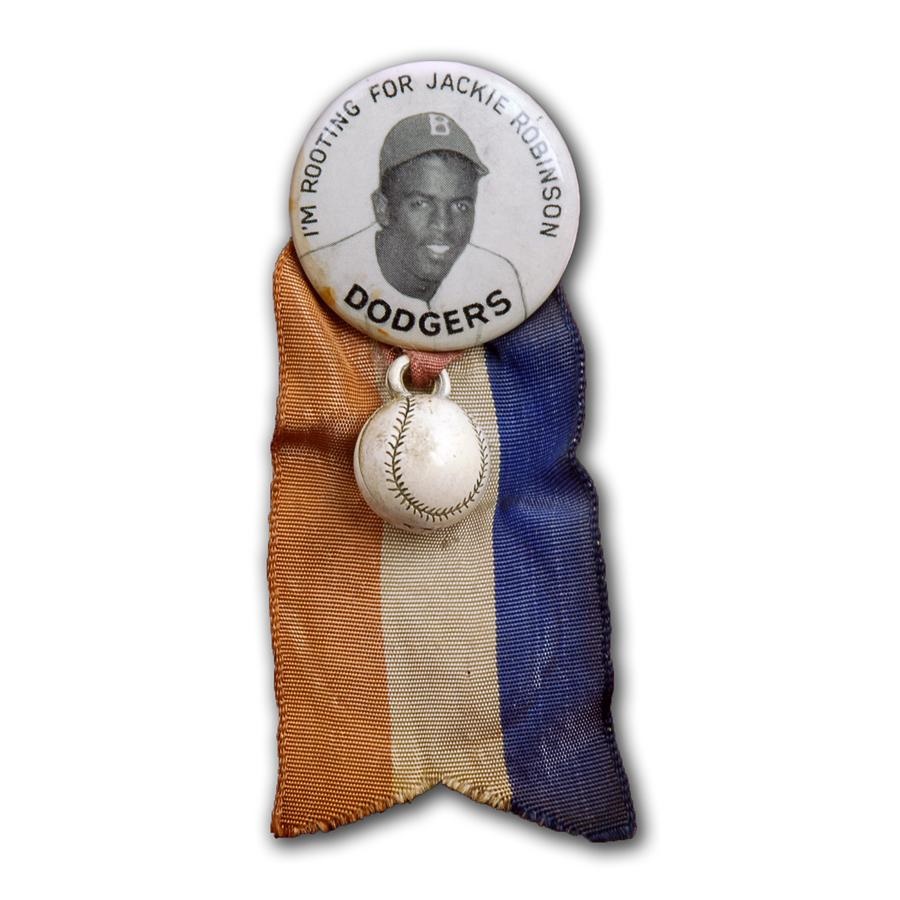 This pin reads: "I'm Rooting for Jackie Robinson" around the top edge, and "Dodgers" along the bottom of the pin, with a black and white image of Robinson in the middle. Comes with original ribbon and baseball ornament, which is slightly toned. Pin is in nice condition with slight foxing on left edge. Ribbon has naturally faded from its original bright colors, but our love for Jackie will never fade.
