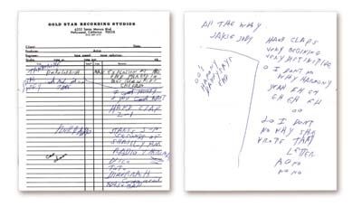 Perhaps the most important song from the first true punk band in America or anywhere else. Right from the studio of Phil Spector who produced the album, it is on "Gold Star Recording Studios" song recording masthead. Written in the hand of Joey Ramone, it includes lyrics, handclaps, "mass explosion at the end" and directions for "shrill AM radio." Written on both sides and measuring 8.5x10". EX.