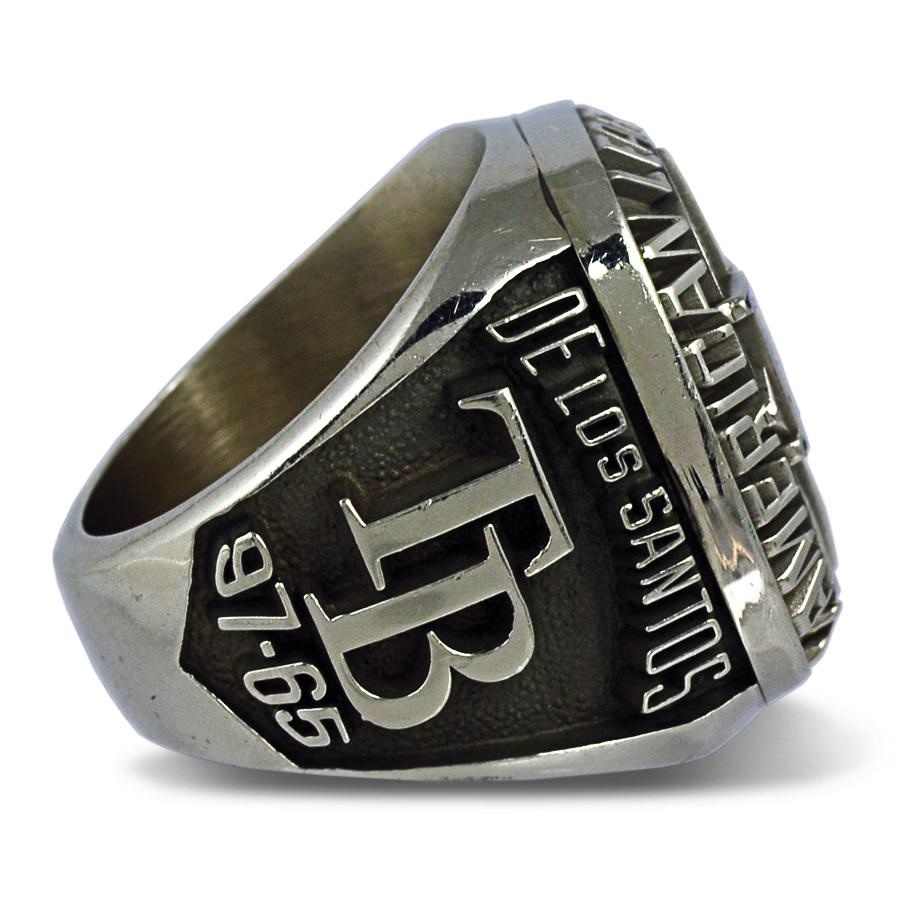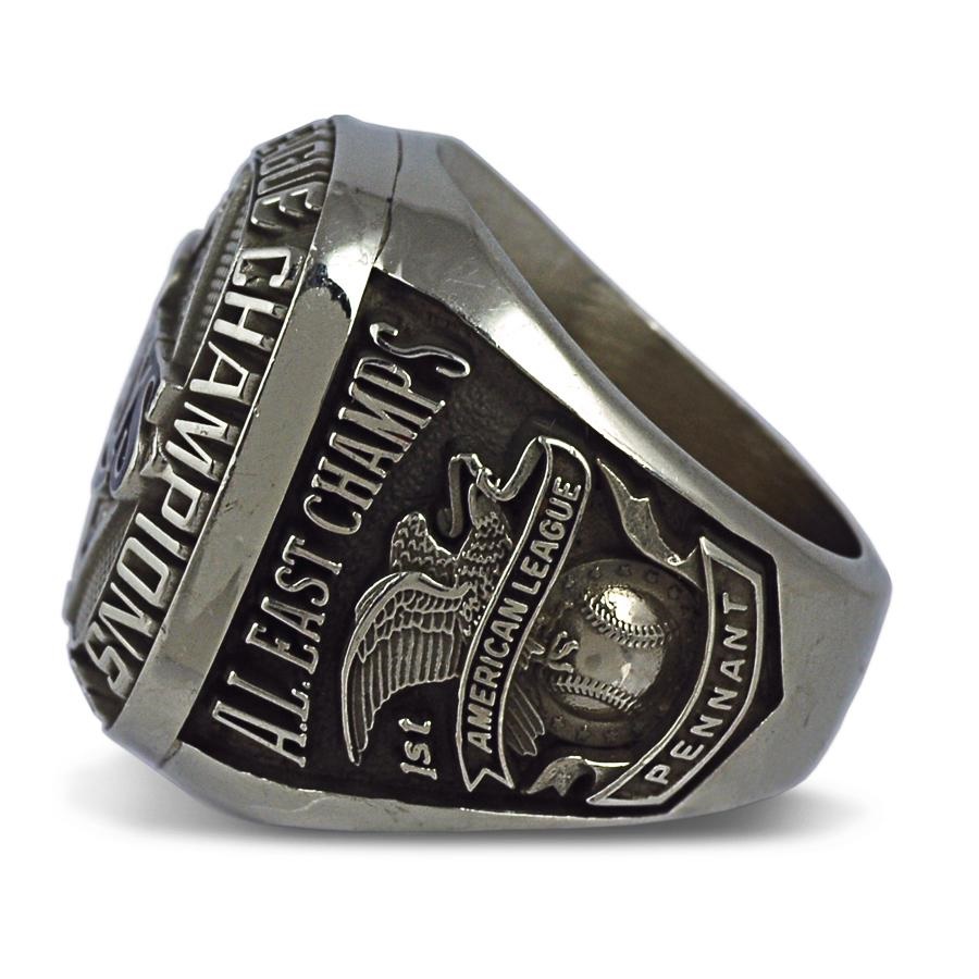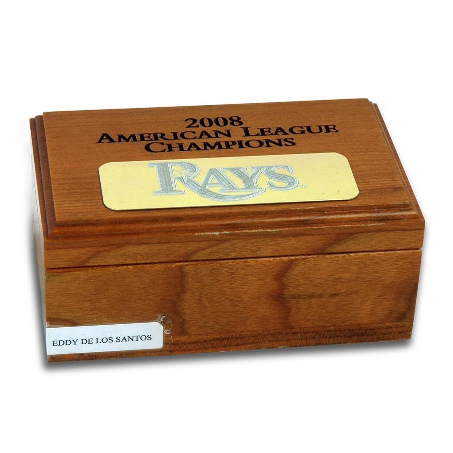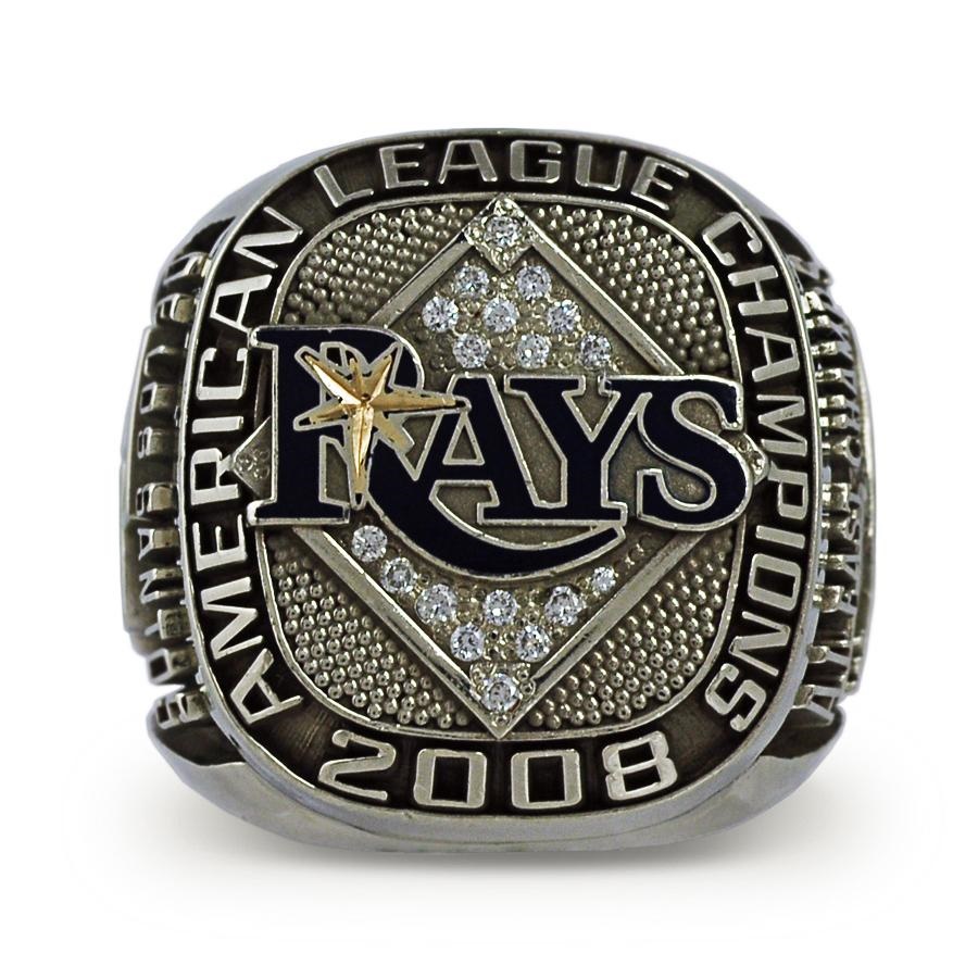 Ten Karat white gold ring was awarded to a Devil Rays scout for the 2008 team accomplishment of winning the American League Championship. On the top of the ring is the Rays logo in enamel with a diamond filled baseball diamond. Wording on the rim is "2008 American League Champions." One side has "DeLosSantos" at the top with "TB 87-65" below. Other side has "A.L. East Champs" with the American League logo below. Inside is stamped "8=6" and "10K". NRMT condition and comes with the original presentational display box. Size 11.