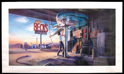 Large limited edition (626/700) print is signed by the three band members--Beck, Hymas and Bozzio-in perfect pencil at bottom right. Sure to impress all your rocker friends. Professionally matted and framed.