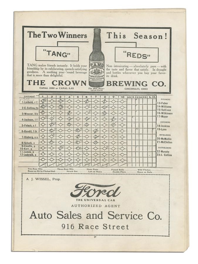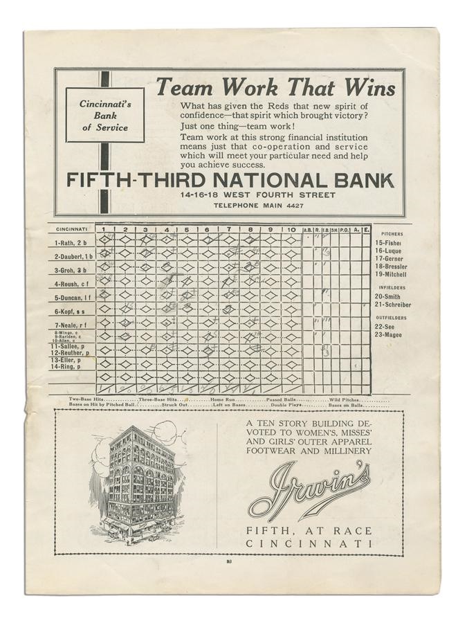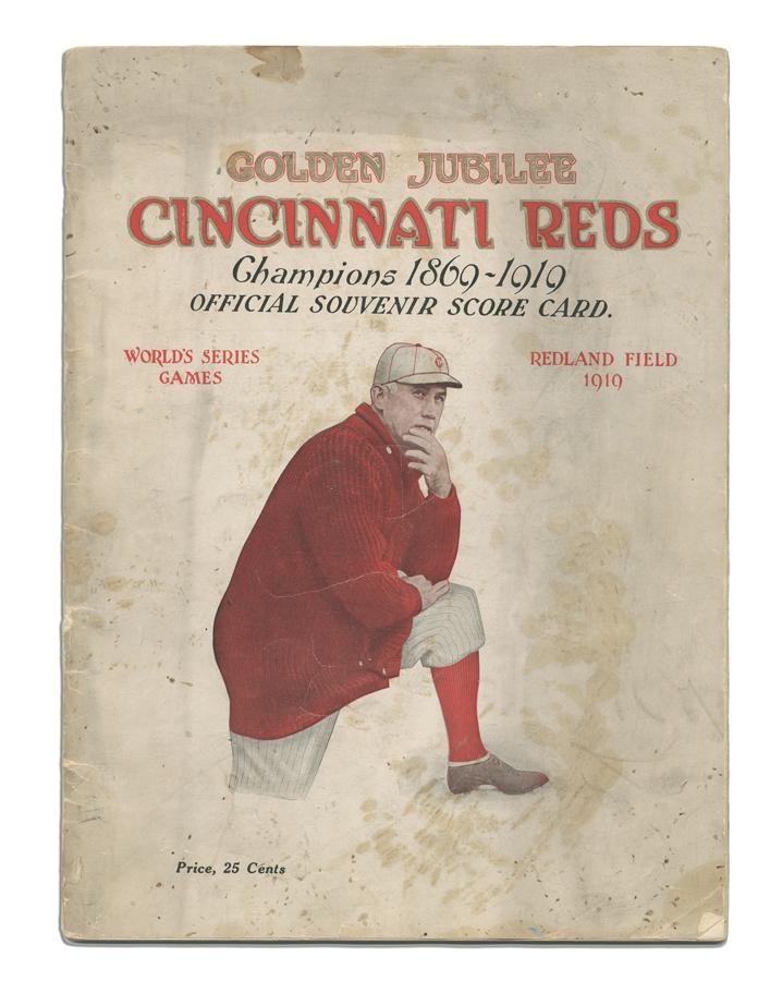 This scored program reads, "Golden Jubilee Cincinnati Reds, Champions 1869-1919, Official Souvenir Score Card." Also printed: "World's Series Games," "Redland Field 1919" and "Price, 25 Cents." Some staining on the front and back covers, and some inside pages have detached from the staples in the spine, but otherwise a great piece with period advertisements throughout the inside, from Coca Cola to Aromints. Refreshing for a Reds fan!