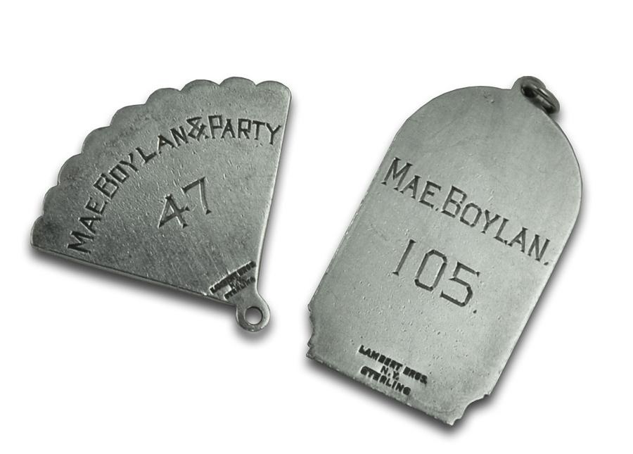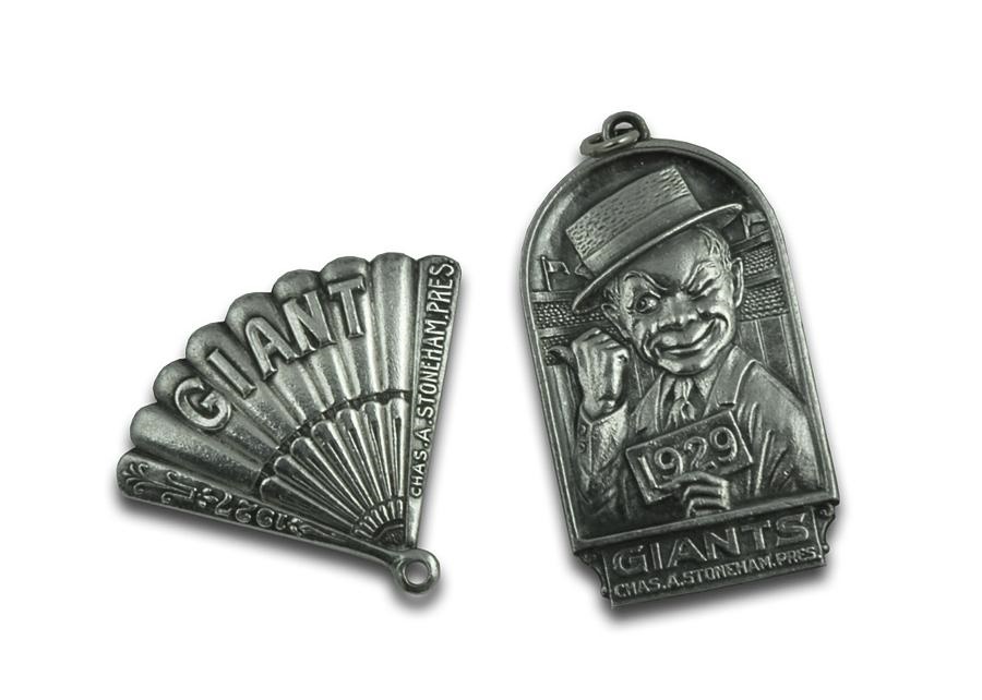 This is a lot containing two sterling silver season passes for the New York baseball Giants. The first, measuring approximately 1 1/2x1 1/4" and featuring an array of bats displayed like a fan, is dated 1927. The front reads "1927 GIANTS Chas. A. Stoneham, Pres." while the back is inscribed "Mae Boylan & Party 47." The second, measuring approximately 1 x 2" and dated 1929, shows a man in a hat winking on the front, which reads "1929 GIANTS Chas. A. Stoneham Pres." The back is inscribed "Mae Boylan 105." Both passes are by Lambert Bros. New York and are in very nice condition. They are clean, show light wear, and have minor scratches on the backs.