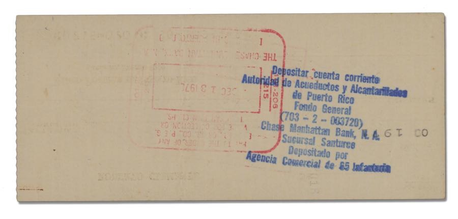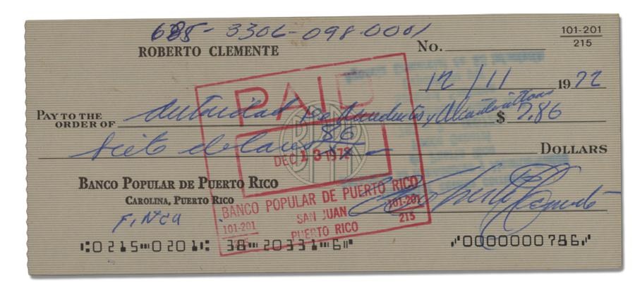 Baseball icon Roberto Clemente was killed in a plane crash on December 31, 1972. This check, dated 12/11/72, was written by Clemente less than three weeks before his death. The check is rare in that it has Clemente's name printed at the top, unlike the checks we usually see. Written in the amount of $7.86, it is made to Autoridad de Acueductos y Alcantarillados and drawn on Banco Popular de Puerto Rico. "FINCA" is printed above the account number, and the check is signed by Roberto Clemente. The bank's "PAID" stamp goes through the "Ro" in Roberto. Terrific memento of a truly great player who died way before his time.