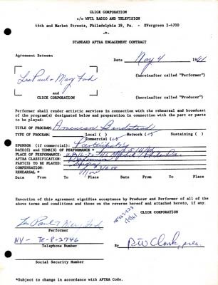 Contract for Les Paul and Mary Ford's May 4, 1961 appearance on American Bandstand, signed by Les, Mary, and Dick Clark. EX.