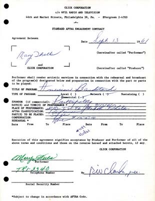 Contract for Mary Wells September 13, 1961 appear-ance on American Bandstand, signed by Mary Wells and Dick Clark. EX.