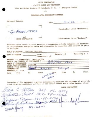 Contract for The Marvelettes March 5, 1962 appearance on American Bandstand, signed by all five mem-bers and Dick Clark. EX.