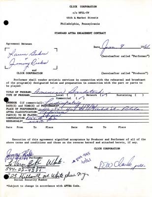 Contract for January 9, 1961 appearance on American Bandstand, signed by LaVerne Baker and Dick Clark. EX.