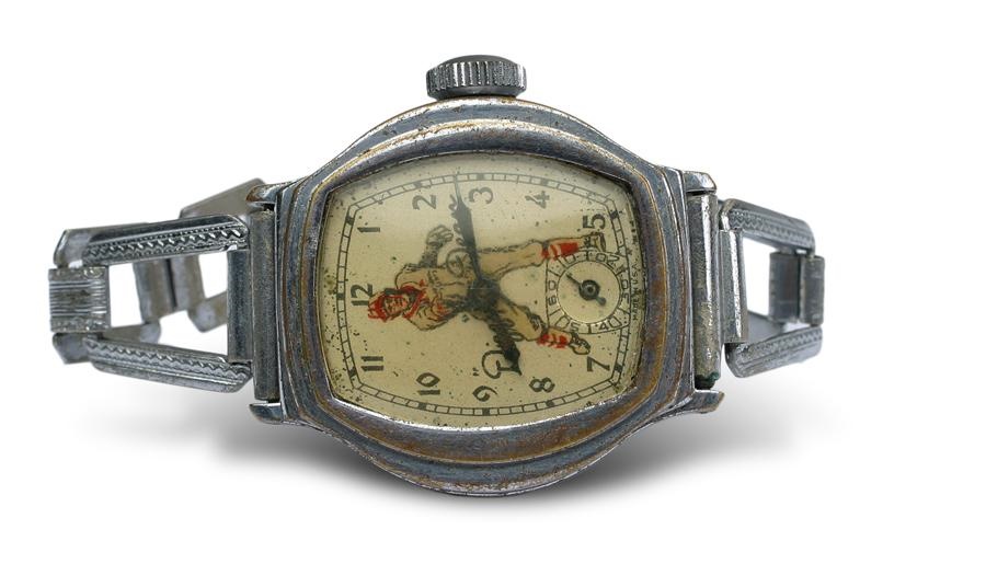 This rare 1930's wristwatch features the likeness of Gashouse Gang member Dizzy Dean pitching in his St. Louis Cardinals uniform. This art deco design best of all comes completed with the original link chain similar to the earliest Mickey Mouse watches. Dizzy Dean's facsimile signature is written across the face in red. Watch shows normal wear for an item of its age; crystal is intact, but the watch is not running.