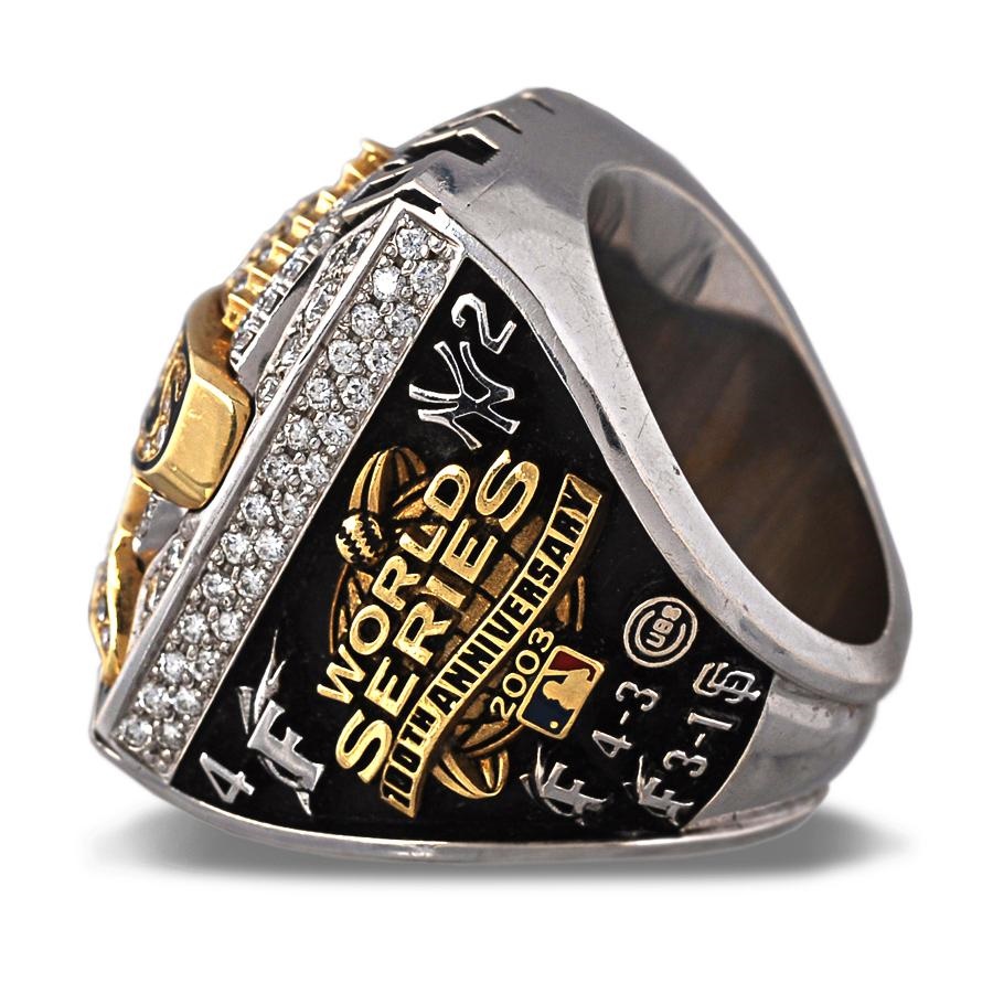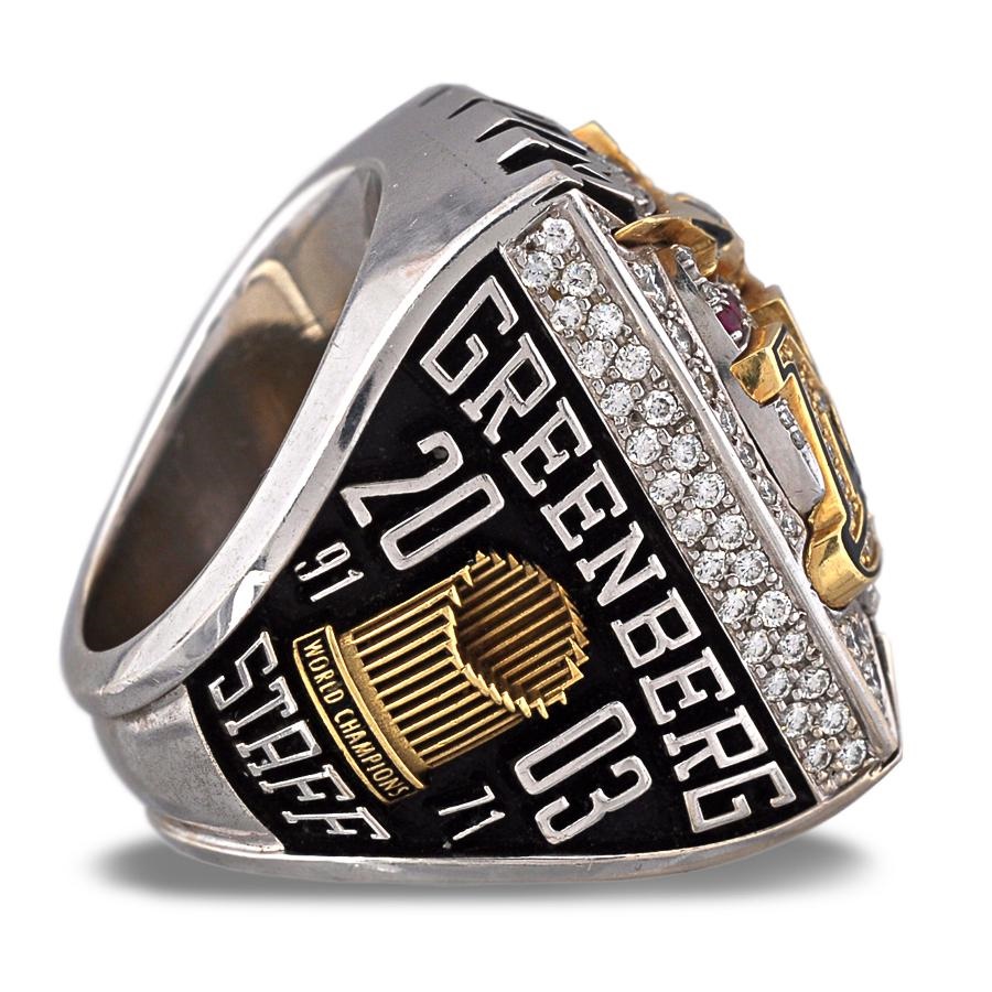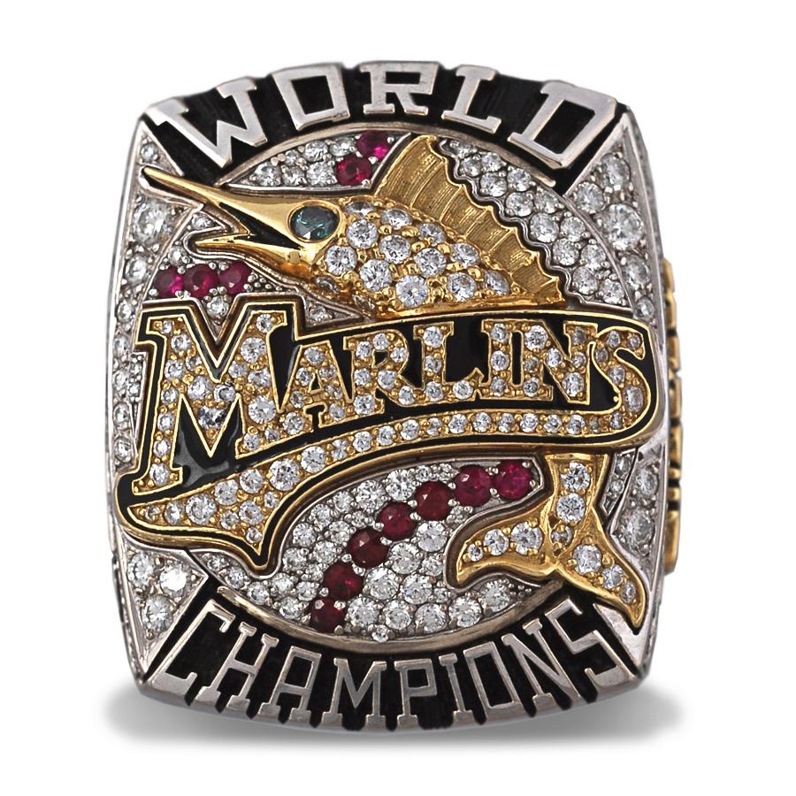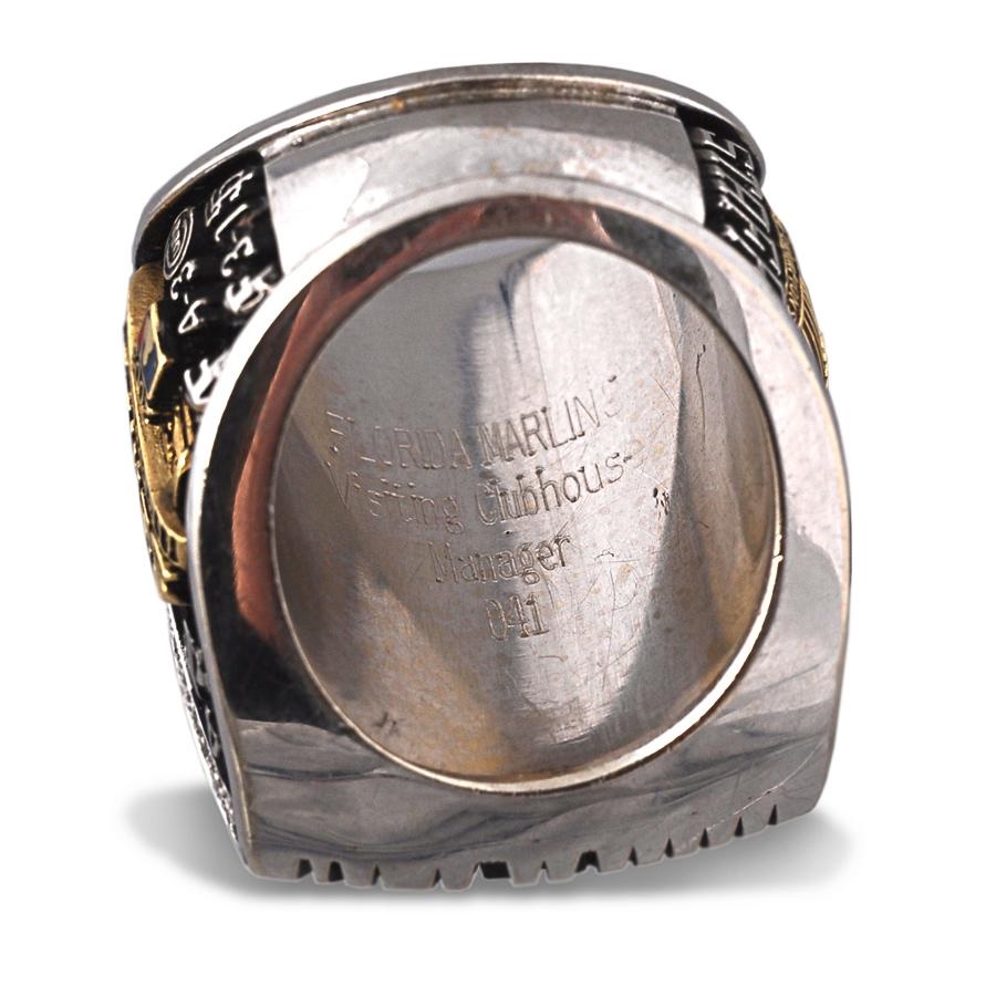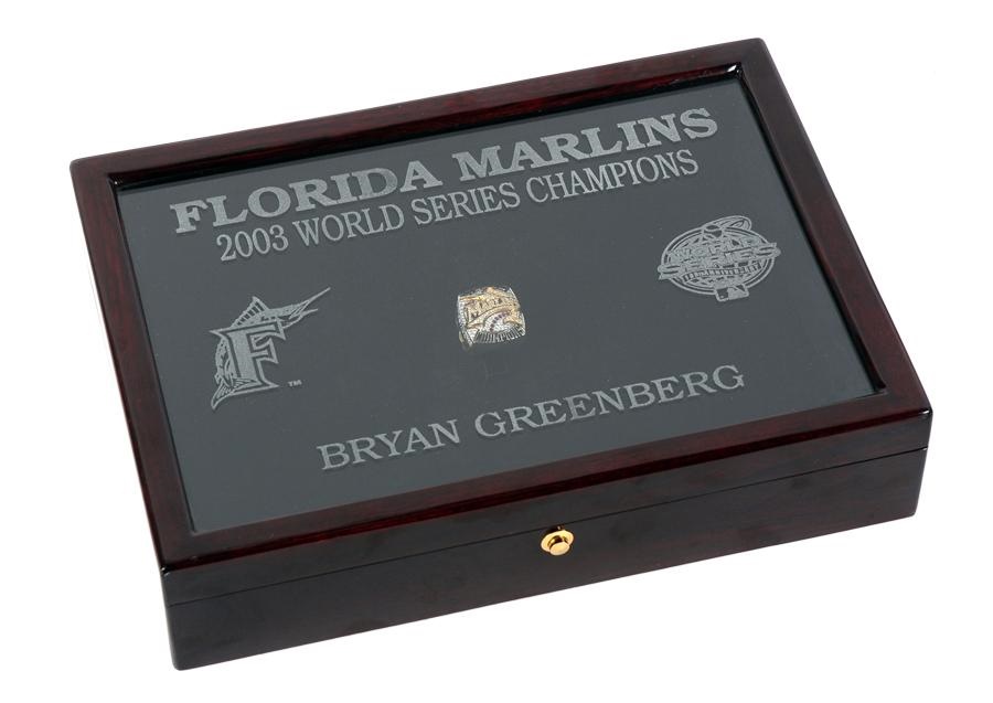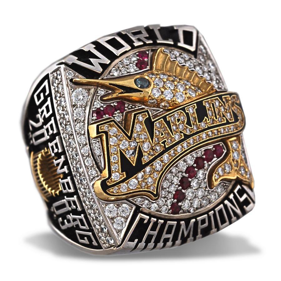 When the Marlins beat the Yankees in the 2003 World Series, Josh Beckett became a star and was awarded MVP. This colossal ring was given to Bryan Greenberg, the manager for the visiting clubhouse . Intergold, who made the ring, was the official manufacturer of the 2003 Florida Marlins World Series Championship rings. The wooden mahogany and glass box reads: "Florida Marlins, 2003 World Series Champions, Bryan Greenberg." The ring is comprised of 14K white gold and 18K yellow gold. A diamond and ruby cluster surrounds the face of the ring which reads, "World Champions" and "Marlins." One side says, "Greenberg 2003 91 71 World Champions Staff" and the other side of the ring reads, "4F 2Y, World Series, 100th Anniversary, 2003, F 4-3 Cubs, F 3-1 SF." Inside is stamped with "Intergold 14K" and is engraved with, "Florida Marlins, Visiting Clubhouse Manager, 041." The eye in the marlin is a .06 carat round brilliant cut teal diamond. Bead set in the yellow gold are 98 1.0 mm to 1.8 mm round brilliant cut diamonds with a weight a total of 1.44 carats. Bead set in white gold are 130 1.0 mm to 2.7 mm round brilliant cut diamonds with an estimated total weight of 2.7 carats. Seven 2.0 mm and five 1.85 mm round faceted, transparent, dark red-purple rubies also adorn this gorgeous ring. Gems weigh a total of approximately 4.75 carats, and the ring weighs a total of 106 grams. The estimated replacement value is $32,500. This is the first of its kind we've seen sold at auction with its original box. Appraisal can be faxed to you. Intergold LOA and Appraisal Certificate included. Size 11.5. Sweet.