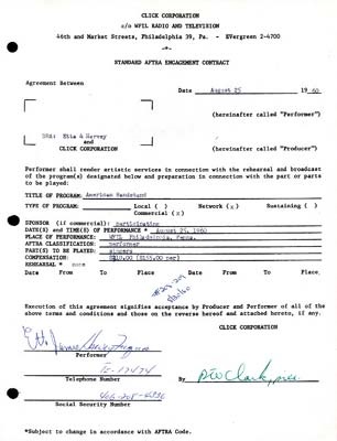 Etta and Harvey was Etta James and Harvey Fuqua. Contract for their August 25, 1960 appearance on American Bandstand, signed by Etta James, Harvey Fuqua, and Dick Clark. EX.