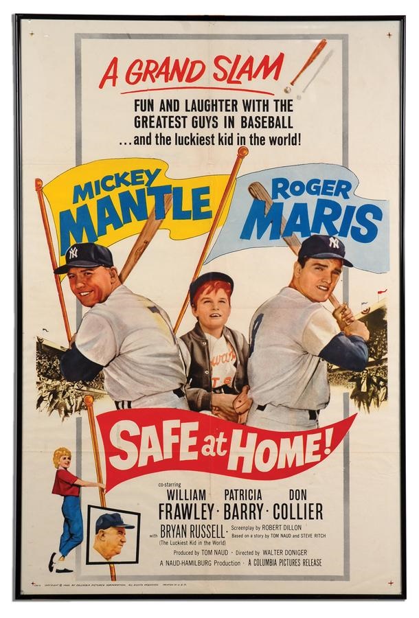 After their single-year home run battle of 1961, Mickey Mantle and Roger Maris were tapped to appear in the 1962 baseball movie entitled "Safe at Home." This is an advertising poster for that film, featuring both Mantle and Maris in full color. The paper poster has been framed to measure 27 x 41 1/2" and fold lines are visible. There are also some thumbtack holes at the top and in the corners, and two small areas at the top left where paper is missing. A great piece for display.