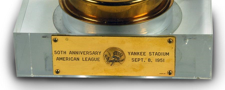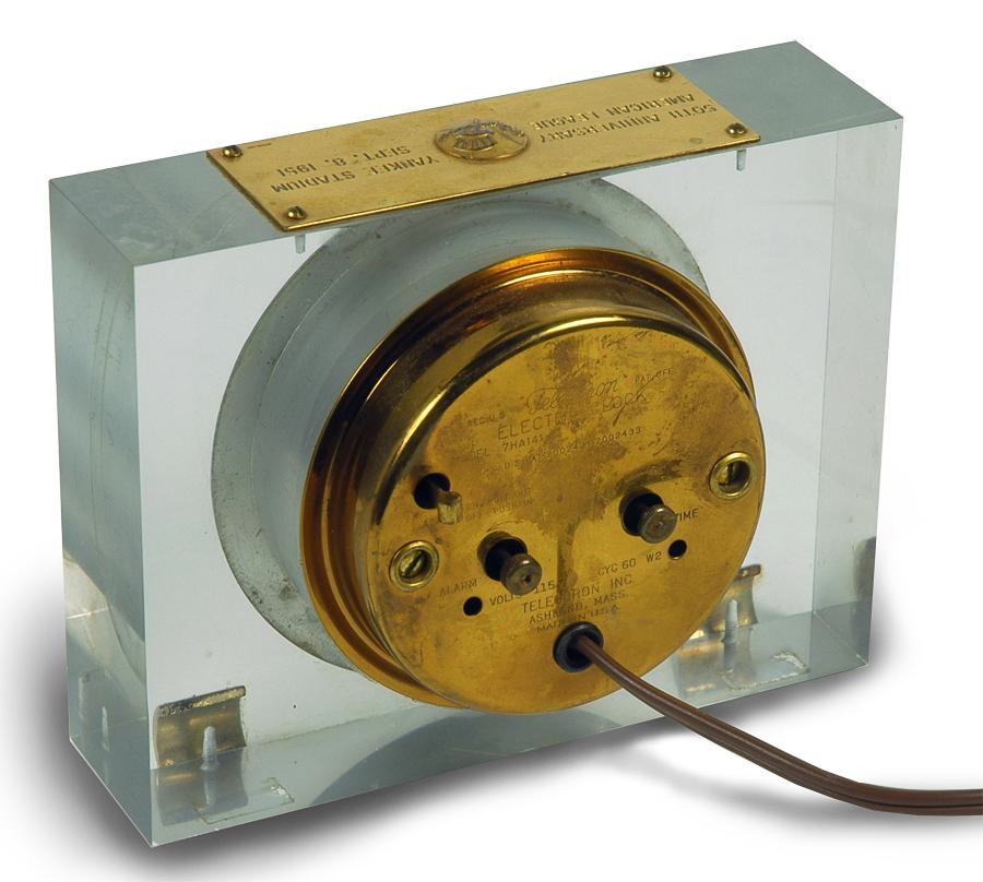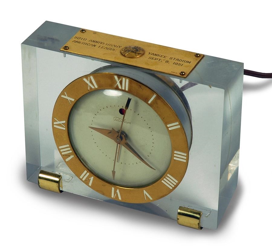 This plexiglass electric Telechron clock appears to have been given to someone on the field. Plaque on top of the clock reads, "50th Anniversary Yankee Stadium, American League, Sept. 8, 1951". Best of all, it still works great! Back of the clock has alarm setting where you pull a piece out or push in to set the alarm. Two separate pieces get turned to set the alarm time and to set the actual time.