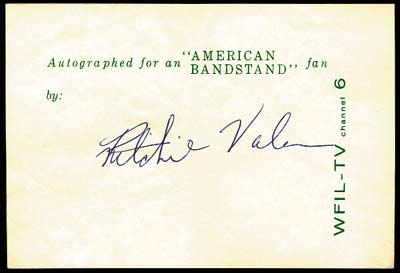 Striking Richie Valens auto-graph in blue biro. Circa 1958. One of the rarest of all rock autographs as Richie Valens, famous for Come On, Let's Go and La Bamba, died on February 3rd, 1959 (the day the music died) along with Buddy Holly and The Big Bopper in that fateful plane crash. Richie was only 17 and had only been a recording star for about a year. NRMT.