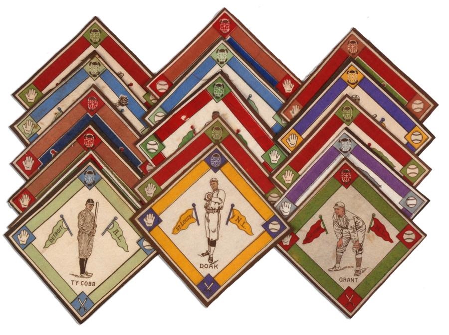 This is a collection of 16 vintage felt tobacco blankets featuring baseball players, including a number of Hall of Famers. Each measures approximately 5 1/4" square and all are in really nice condition. Blankets include Cobb (EX), Grant (VG/EX) and Meyers (EX+) with green borders; Doak (EX) with a yellow border; Walsh (NRMT o/c) and Bassler (EX) with purple borders; Johnson, Shanks, Gandil, Ainsmith, and Miller (all EX) with red borders; Mann (EX) and Griffith (VG) with blue borders; and Cole, Hartell and Cole (all EX) with brown borders.