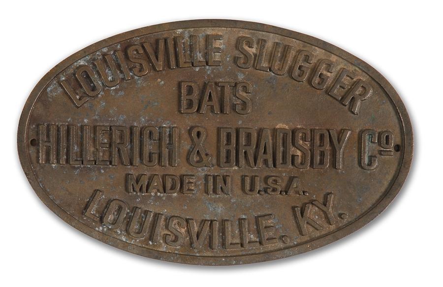 This sturdy brass sign bears the same look as the one that is printed on the H&B bats, with its signature oval shape and capital letters. It originally hung outside the Hillerich & Bradsby factory before the factory relocated. The sign measures 10 1/2 x 6 1/2", and you can see the oxidation that has taken place over the years. It has two mounting holes on each side. Sturdy piece of memorabilia from Hillerich & Bradsby, the makers of bats for Major League Baseball.
