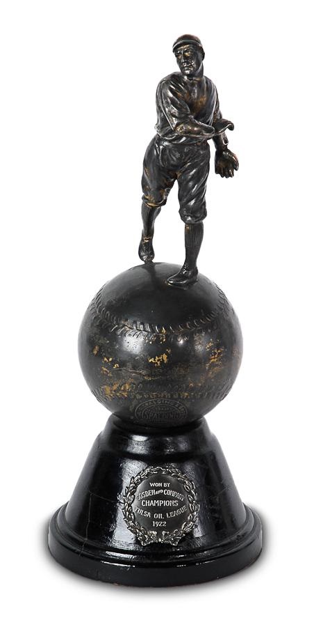 Another terrific piece from the very collectible 1920s series, this Spalding trophy features a figural right-handed pitcher standing atop a large cast metal baseball with the Spalding logo engraved on it. The ball rests on a black-painted wooden base sporting a plaque that reads, "Won by Cosden and Company -- Champions -- Tulsa Oil League 1922." Measuring 19" in height from the top of the pitcher's cap to the bottom of the base, this trophy has undergone some professional restoration. A beautiful addition to any collection