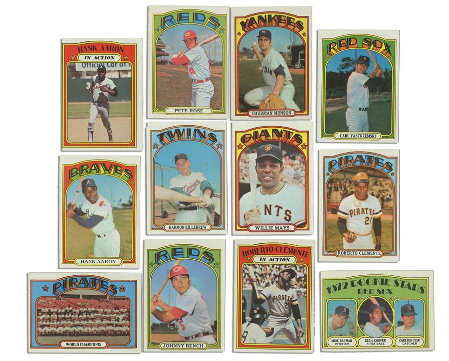 This is a really great-looking complete 1972 Topps Baseball Card set in a loose leaf binder with all cards encased in protective plastic sleeves. Overall, this terrific set grades NRMT to MT. Among the individual notables are Willie Mays (NRMT), Harmon Killebrew (NRMT), Carlton Fisk (EX off-center), Hank Aaron (NRMT), Aaron in Action (NRMT off-center), Roberto Clemente (NRMT), Clemente in Action (NRMT), Johnny Bench (NRMT), Thurman Munson (NRMT), Tom Seaver (NRMT) and Pete Rose (EX/MT).