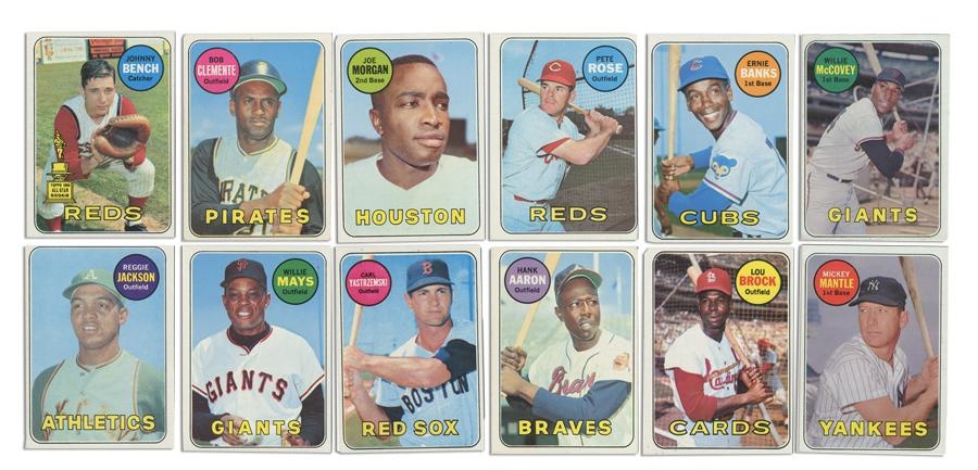 Complete 1969 Topps Baseball Card set in a loose leaf binder with all cards in protective plastic sleeves. The overall condition of the set is EX/MT to NRMT. Individual star players include Ernie Banks (NRMT), Joe Morgan (NRMT), Roberto Clemente (EX), Lou Brock (NRMT off-center), Johnny Bench (NRMT), Hank Aaron (EX/MT), Pete Rose (NRMT off-center), Carl Yastrzemski (NRMT), Willie Mays (EX/MT), Mickey Mantle (NRMT), Rollie Fingers (EX), Reggie Jackson (EX) and many others. Interesting set from an altogether very interesting year.