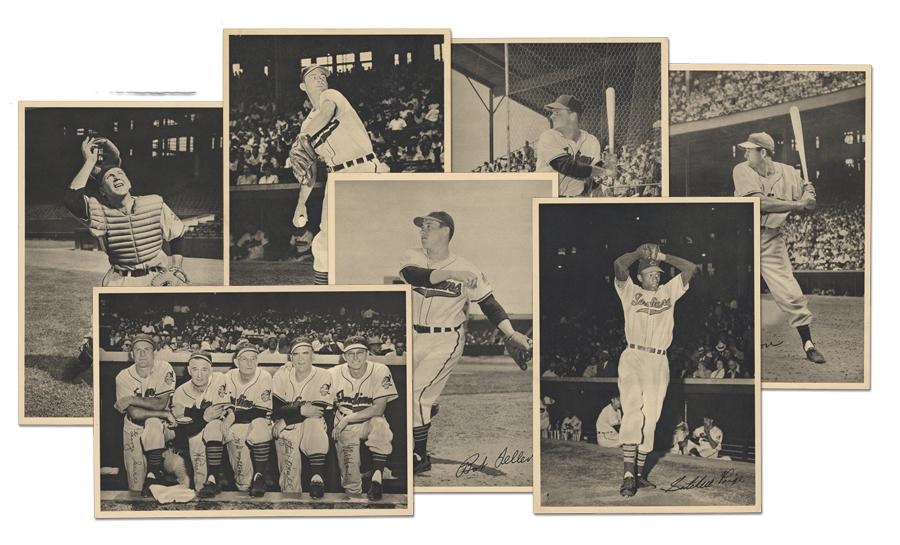 This is a collection of twelve (12) photos of members of the 1949-1950 Cleveland Indians issued by Num Num Foods of Cleveland, Ohio.  The photos measure 6 1/2 x 9" and include Bob Feller, Bob Lemon, Johnny Bernardino, Mickey Vernon, Satchel Paige, Ken Keltner, Hal Peck, Mike Tresh, Frank Papish, Bill Veeck, Hank Greenberg, and one of the coaching staff (Mel Harder, Steve O'Neill, George Susce, Muddy Ruel and Bill McKechnie).  All have the Num Num stamp on the back and are in EX-MT to NRMT condition.