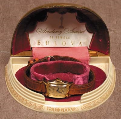 Out of this world piece rep-resents the highest award in film. Case is magnificent. Style is that of the Hollywood Bowl shaped like a sym-phonic dome with a 3-D golden figure of the "Oscar" in front. Rimmed in celluloid, the maker's name "Bulova" streams across the front. When the case (5.5x3.25x1.5") is opened, it reveals, again, the look of the Hollywood Bowl, and the watch is set on a bed of soft red very royal looking cloth. Above is an elegant satin back reading, "Academy Award 21 Jewels Bulova" with striking image in gold of the copyrighted Oscar statuette. Pure art deco watch in 14k GF with original brown alligator band is engraved "Eternal Friends Love Debbie." We are not sure which Debbie (Reynolds?). Original "Academy Awards" hanging tag and simply an outstanding piece.