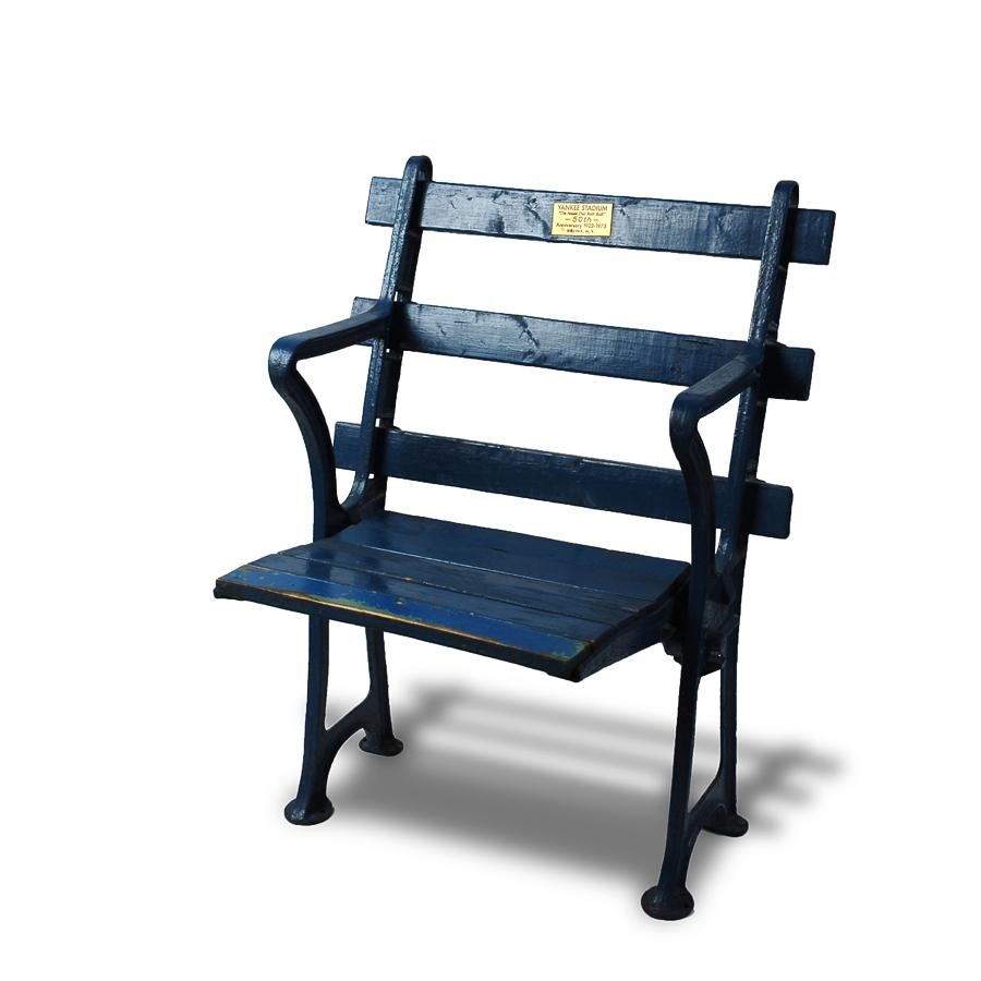 From head-to-toe (or, rather, feet) this original Yankee Stadium flat back seat is a beautiful piece for the stadium collector. Imagine the different people that sat here to witness the Yanks defeat countless teams, from the Depression and World War II era, to the Elvis and Woodstock days. It represents all Yankee fans through the years. Its gold plaque (placed over the seat number) reads, "Yankee Stadium, 'The House That Ruth Built', -50th-, Anniversary 1923-1973, Bronx, N.Y." It measures 24 x 12 x 31". It has been painted blue, yet when you pull down the wooden seat some paint chipping is evident, revealing a previous coat of mint green.