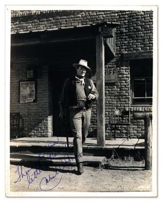 Showing the Duke as the sheriff in Howard Hawk's masterpiece Rio Bravo, this is a masterful quality Hollywood promotional still in a tapestry finish. The signature in mint blue ink reads, "Thanks for your letter, Harry...John Wayne." The 8x10" photo-graph comes from the famed collection of Harry Wilkinson of Marblehead Mass. and is stamped as such on verso. Signature is perfect: dark and NRMT. Photo has a cou-ple of pinholes o/w EX.
