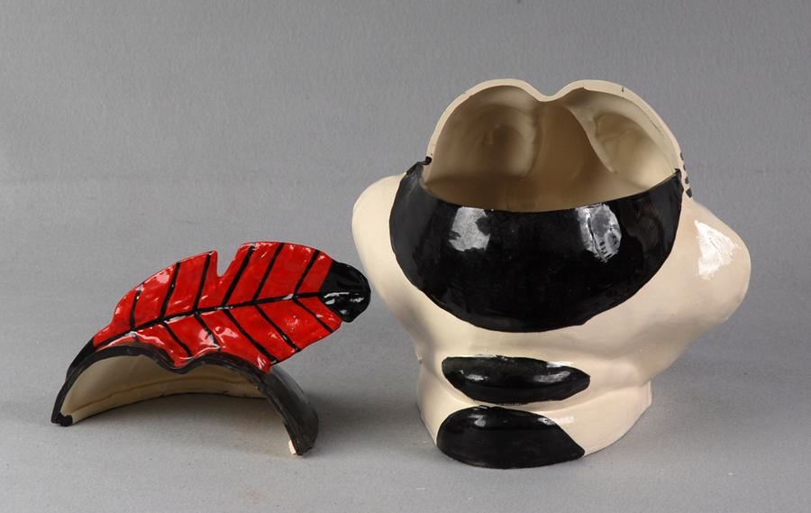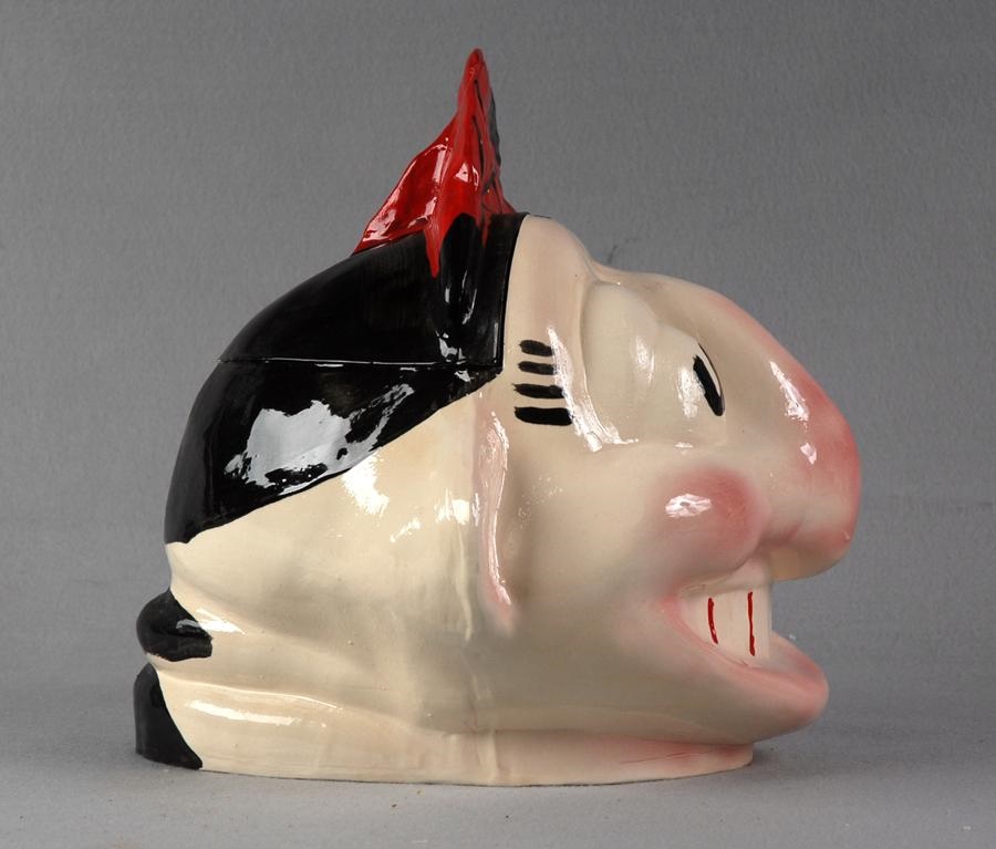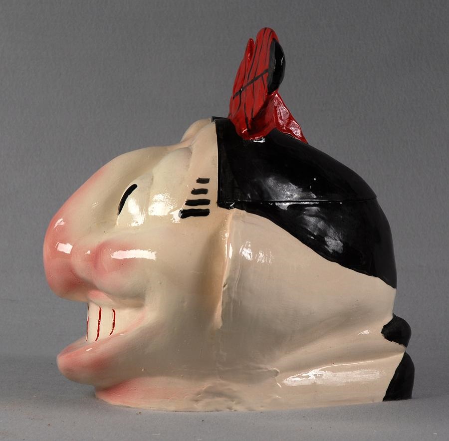 This cookie jar features a rather saucy smile from the Cleveland Indians' mascot, Chief Wahoo. The exaggerated features like his popping eyes and red cheeks just make you smile when you look at it. Small black paint strokes create a bit of hair on each side of Wahoo's face. The red feather on top is connected to the back of his head, which lifts up easily as the cover of this cookie jar. The jar measures 33" in diameter, and almost one foot in height. This is nicely painted and shellacked, with some shine worn off on the back of the head - a great piece for a Cleveland fan. But the question still remains: Who stole the cookies from the cookie jar?