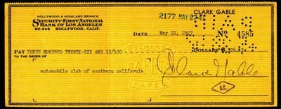 A personal check signed by a Hollywood stud on May 22, 1947. It is made out to the "Automobile Club of Southern California." The signature is perfect on the check that has a light fold o/w mint. Would be wonderful compliment to a framed photo of Gable with a car (as in the hitchhiking scene in It Happened One Night?).