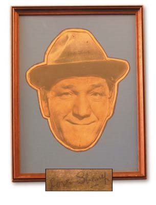 Real photo on cardboard head of this fabulous Stooge dates from the 1940's. Head is magnificent 12 x10" and it is signed on his hat "Love, Shemp" in blue ink. Used for a performance where it was then signed. Beautifully framed with die-cut matting. Couple of pin holes o/w EX. Consigned by the gentleman who owned it for twenty-five years.