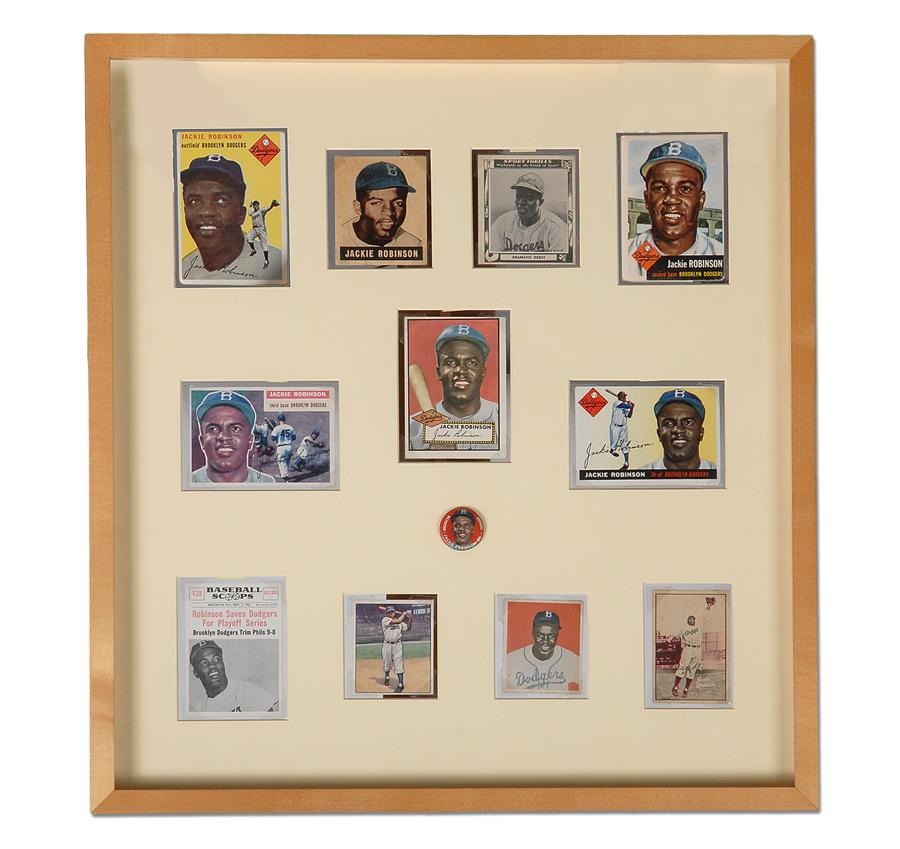 This framed piece measures 18 1/2 x 20 1/2", and features 11 Jackie Robinson baseball cards and one pin. Included are '52 through '55 Topps cards, '49 and '50 Bowman cards, a '61 Baseball Scoops card, and more. All cards are in excellent condition. This is a nice display item for a Jackie Robinson fan.