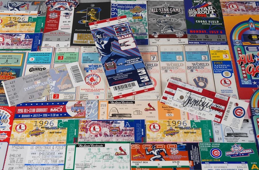Ticket stubs from some big baseball events including World Series games, All Star games and both NLCS and ALCS game mostly from the 1980's and 90's and even a few sprinkled in from the 2000's.  Includes some special game tickets also like Mark McGwire's 500th homerun and Ryne Sandberg's last game at Wrigley Field signed by Sandberg.  In addition to tickets, there are some special passes to World Series and All Star games and events.  Average condition is EX with some a bit worse and some better.