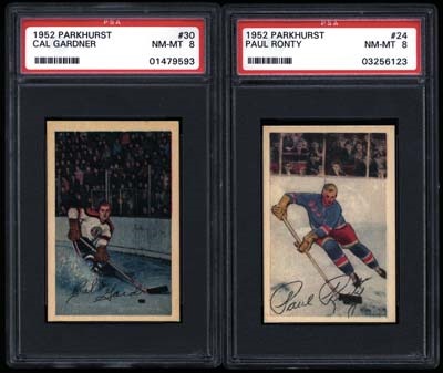 PSA 6 graded The second Parkhurst issue used colored drawings on the card front. These are some of the most attractive hockey cards of all time. These are extremely tough to find in top condition. This lot has (9) PSA 8's: #24 Paul Ronty, #30 Cal Gardner, #33 Pete Conacher, #34 Leo Boivin, #46 Harry Watson, #47 Fern Flaman, #75 Joe Klukay, #99 Bones Raleigh, and #104 Reginald Sinclair. The following are PSA 7's: #20 Wally Hergesheimer, #53 Alex Delvecchio, and #67 Red Kelly. There are (2) PSA 6's: #83 Pentti Lund and #103 Jim Conacher. All are graded with no qualifiers.
